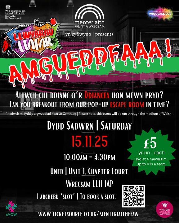 Taith o gwmpas dinas Wrecsam i ymweld â rhai o lefydd fwyaf arswydus y dref, clywed hanes rhai o’r cymeriadau ffiaidd o’n gwmpas ac efallai cwrdd ag ysbryd neu ddwy ar hyd y ffordd! 🎃👻