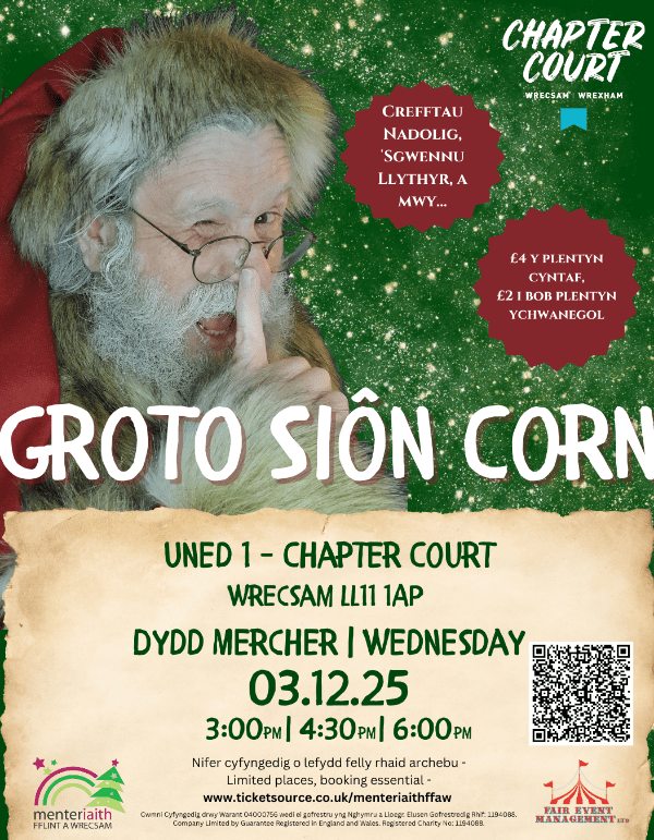 Dewch i gwrdd â Siôn Corn yn Chapter Court, Wrecsam. Bydd cyfle i glywed stori wreiddiol gan ‘y dyn ei hun’ cyn ymuno yn hwyl yr ŵyl gan greu celf a chrefft Nadolig, ysgrifennu llythyr at Siôn Corn a chael ymweld fel teulu â’r Groto i sgwrsio a dymuno Nadolig Llawen i’r dyn a’i farf llaes a’i wallt gwyn.